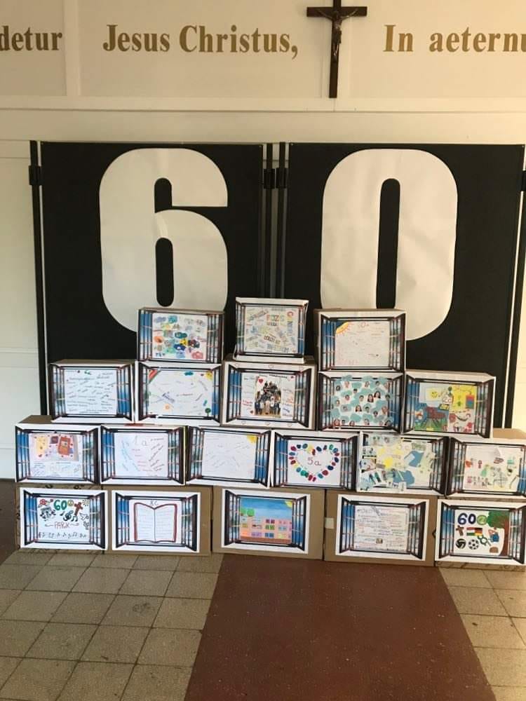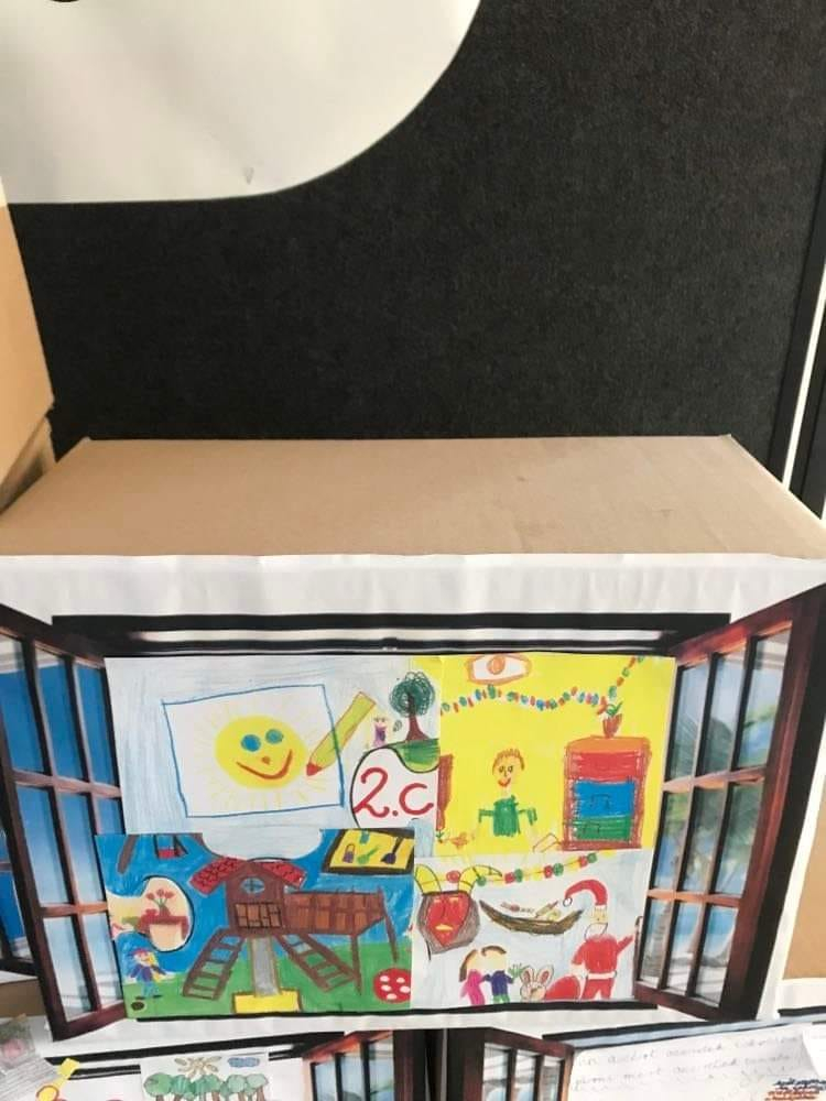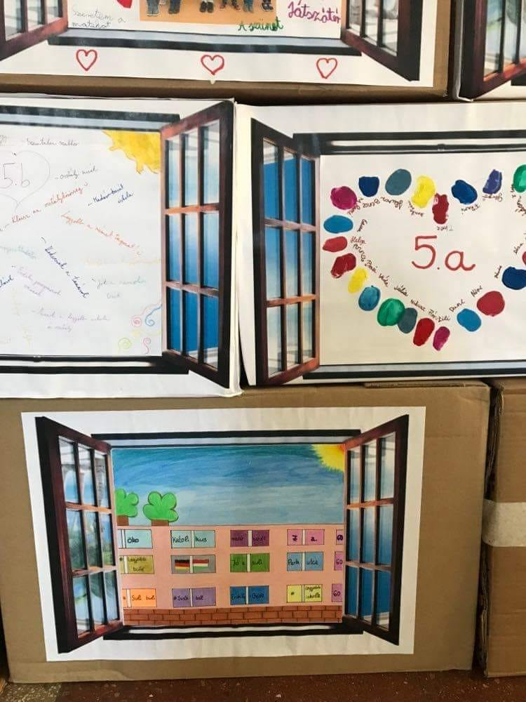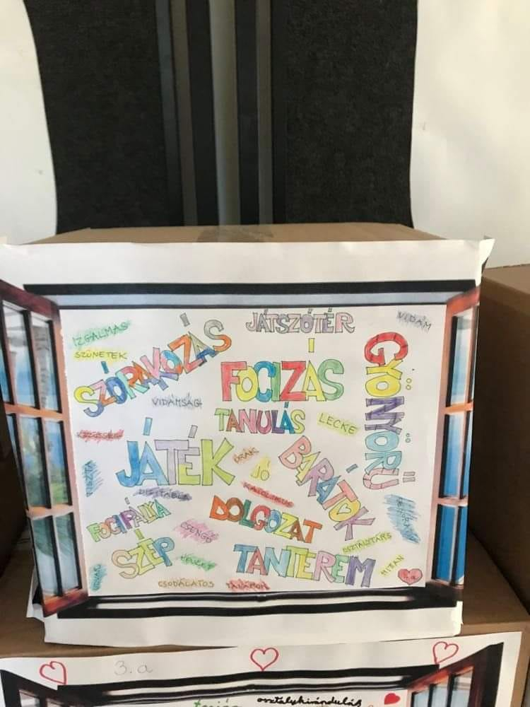 A hét során iskolatörténeti feladatok megoldása mellett az osztályok dobozokból közös munkával felépítették az iskola makettjét.