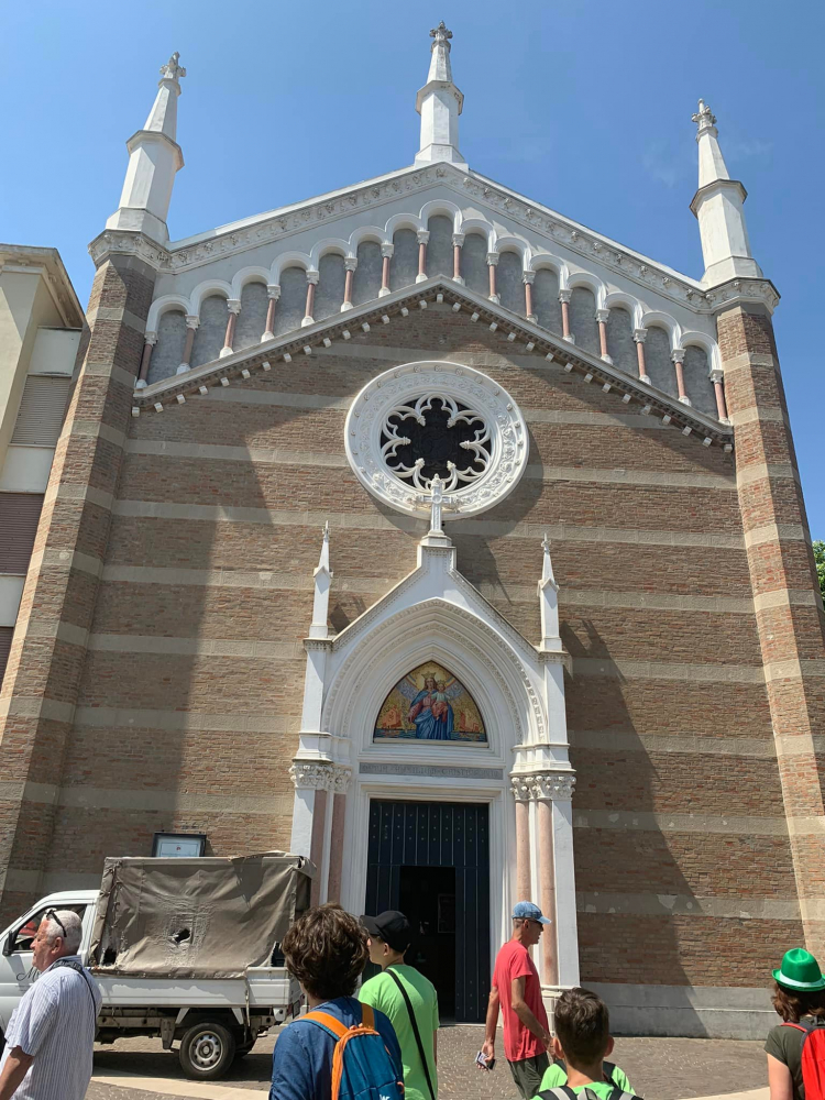 Rimini óvárosában a Santa Maria Ausiliatrice /Mária a Keresztények Segítője/ templomában olasz és magyar egyházi énekeket énekeltünk kipróbálva a mennyei akusztikát, ami úgy szólt mintha minden gyermeknek egy angyal tartotta volna a mikrofont. Az öröméneklés a Nome dolcissimo olasz népénekkel indult, amit a Stella Maris kamarakórus szólaltatott meg. Ó kicsinyke Betlehem –középkori dallama követte latinul. Stefano atya a templom plébánosa, amikor megtudta honnan jöttünk, örömmel mutatta meg a színes Szent István és Szent Erzsébet üvegablakokat és kihangsúlyozta milyen jó kapcsolatot ápol az olasz város Budapesttel és a magyar hívekkel. Ő kérte meg a kórust, hogy énekeljünk magyarul is, amiből Harmat Artúr: Jézus szíve és Derzsi György: Eukarisztikus dalával egy kis hangverseny lett. Szívélyes búcsúzás után megtapasztaltuk, hogy a „szeretet összeköt, a szeretet éltet!” Amikor kiléptünk az ajtón, csodálatos harangjáték szólalt meg a toronyból - az volt a benyomásunk, hogy ezzel köszönik meg látogatásunkat.