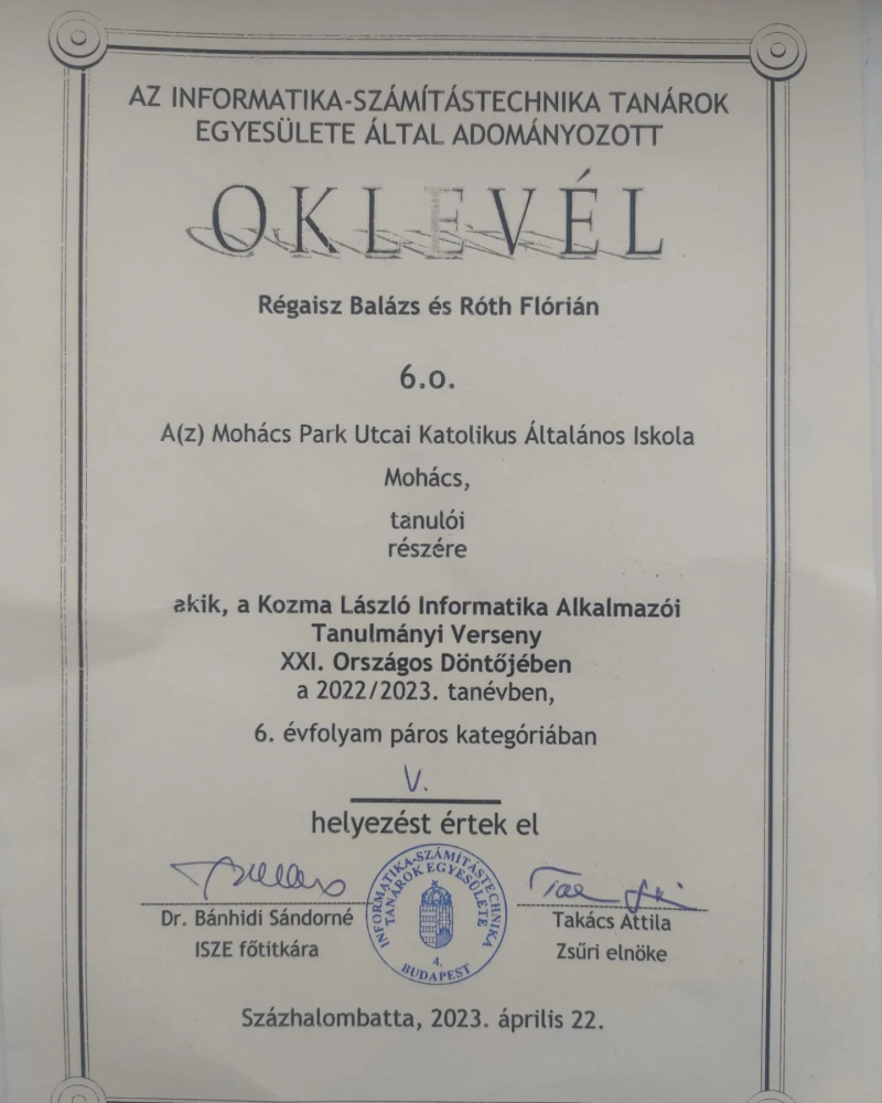 Iskolánk 6. osztályos tanulói Régaisz Balázs és Róth Flórián országos V. helyezést értek el páros kategóriában.