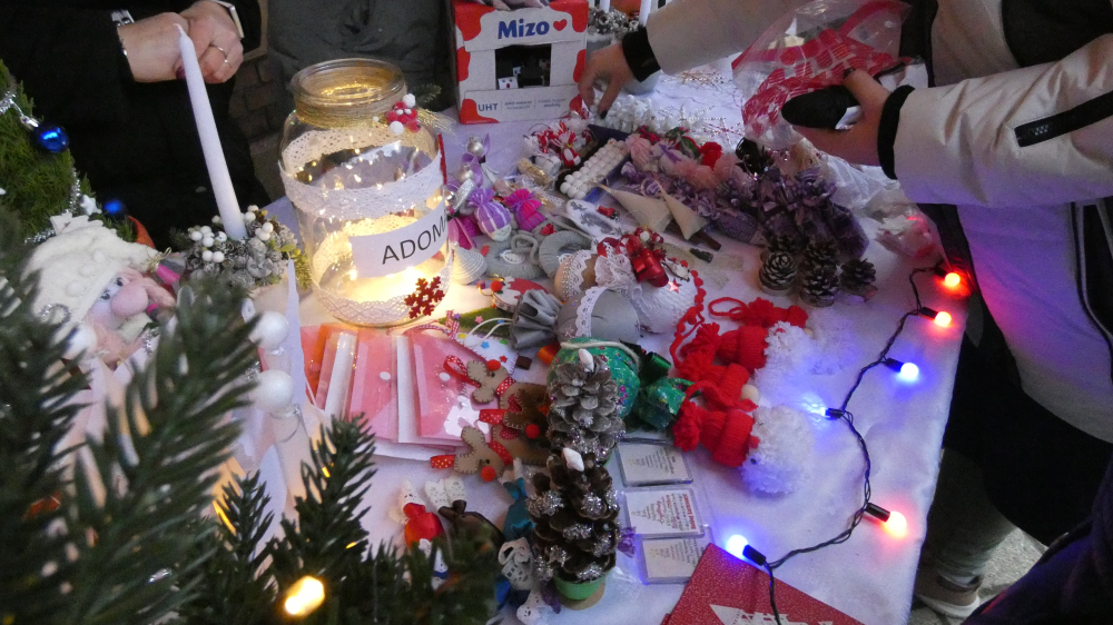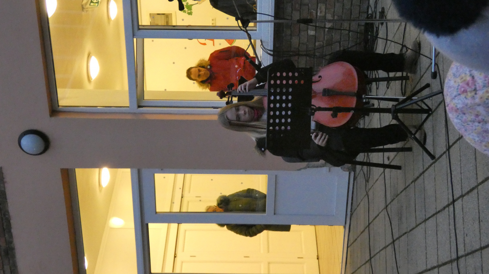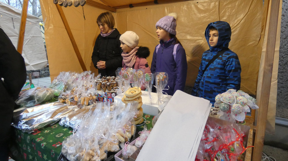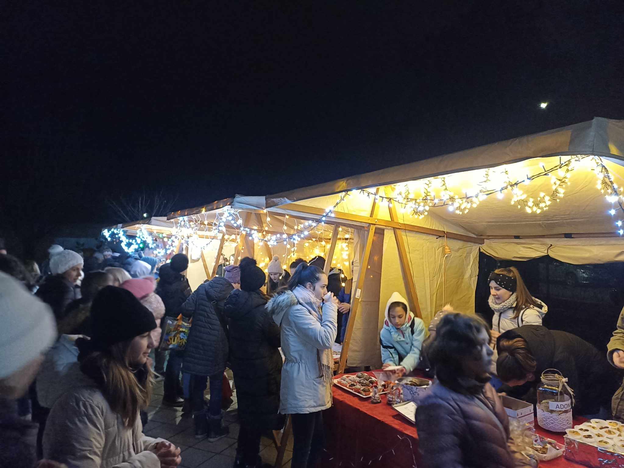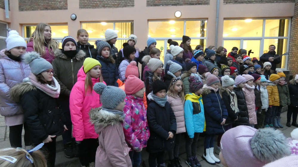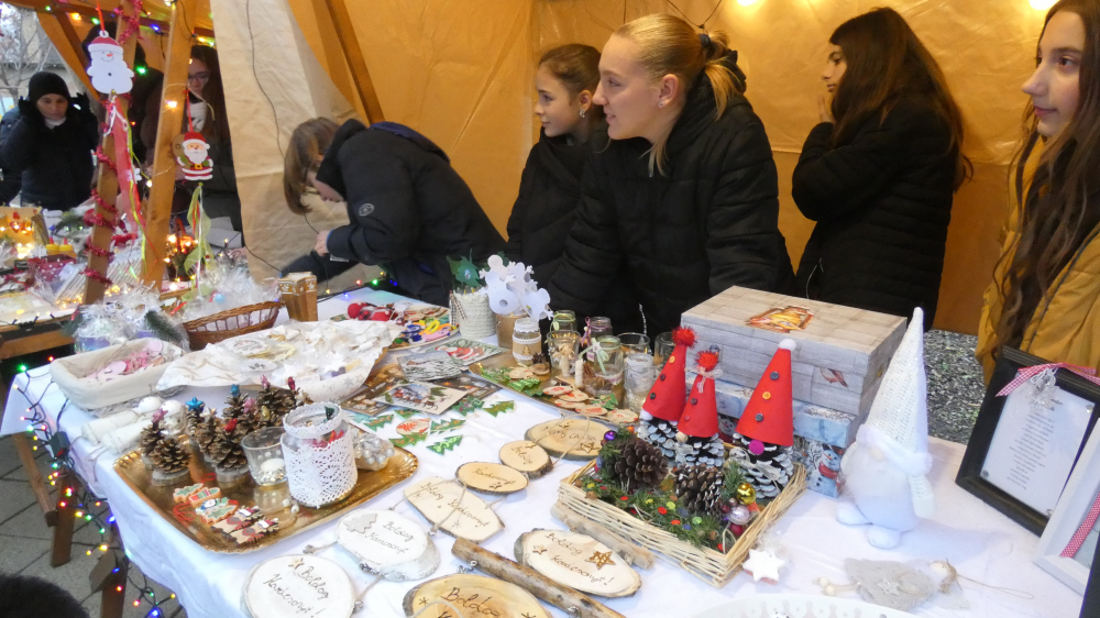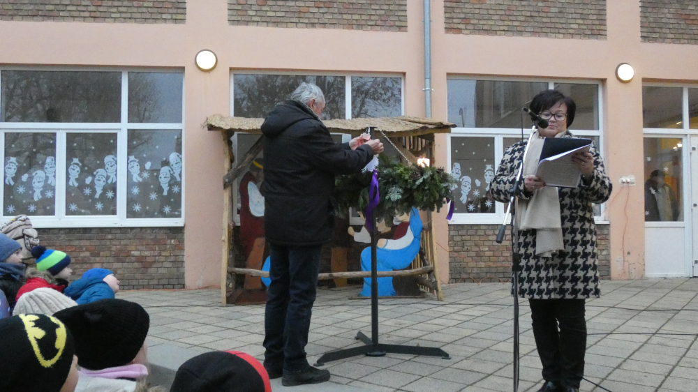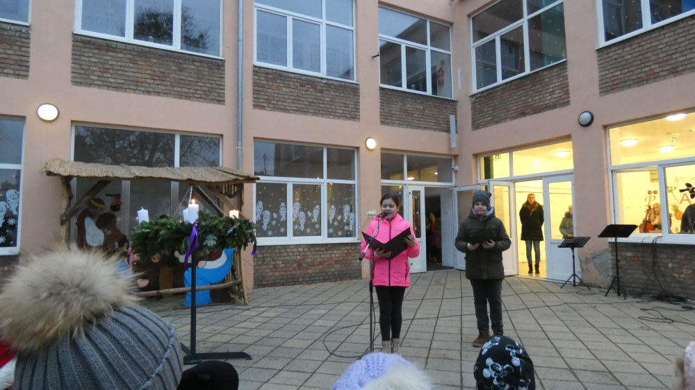 Rövid megnyitó műsorunk részeként hallhattuk Grátz Ádámné, igazgatónő köszöntő szavait, a Kicsinyek kórusának előadásában Iváncsits Tamás Égi fénysugár c. dalát. (Vezényelt Koleszárné Győrki Gizella, gitáron kísért, Iváncsits Tamás.) Láthattuk az 5.a osztály szakköröseinek betlehemes játékát is, Iváncsits Tamás vezetésével. Belló Dalma csellójátéka (felkészítő: Rózsavölgyi Anett), Schäffer Léna és Szeitz Csanád (felkészítők: Prokopné Gyuricza Tímea és Szatmáriné Rádics Ildikó) adventköszöntő verse után vette kezdetét az adventi vásár.
